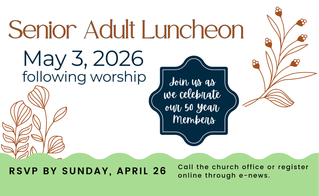 We are delighted to invite our Senior Adults to a special luncheon on Sunday, May 3, immediately following worship. During worship, we’ll also be celebrating our 50-year and 75-year church members! Our senior adult community is a treasured part of our church family, offering wisdom, encouragement, and a legacy of faith that continues to inspire all generations. This luncheon is a small way of expressing our gratitude and creating space to connect more deeply with one another. All adults age 60 and older are warmly invited to stay for lunch, fellowship, and celebration. The cost is $10 per person. The cost is $10 per person. Sign up here to join us for lunch and share in this joyful time together! RSVP by Sunday, April 26.