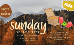 Youth Sunday Supper Sunday, October 5 Youth join us for Sunday Supper! We’ll be going to the Glazener’s house for pickleball, pizza, fun, and fellowship. Meet at the church atrium at 5:00 p.m. and pick-up at the church atrium at 7:00 p.m. No cost. Bring a friend!